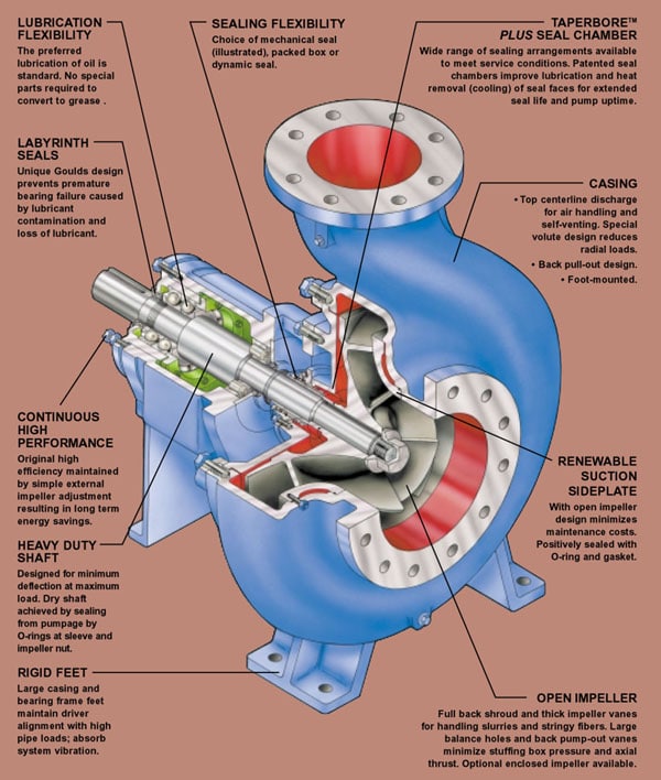 The 3180 heavy-duty process pump features a robust design to handle heavy duty process pumping applications. An open impeller design ensures minimum radial and axial thrust loads to maximize seal and bearing life.