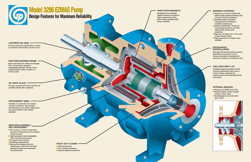 The 3296 EZMAG is a robust, magnetic drive pump compliant to ANSI B73.1 dimensional standards that is reliable, simple and easy to maintain. It is designed to handle challenging applications including applications that require zero emissions and fluids that are difficult to seal. Suitable for liquids such as Syltherm, Nitric Acid, Caustic, Heat Transfer Fluids, Methylene Chloride and Butodiene.