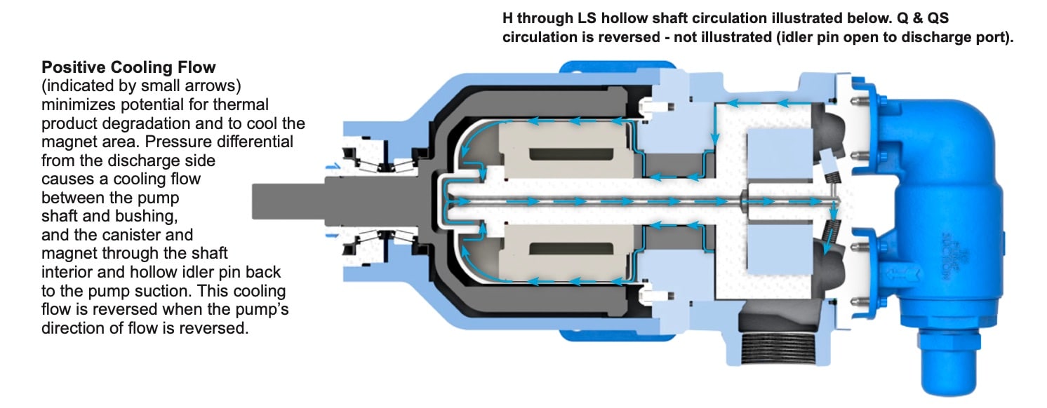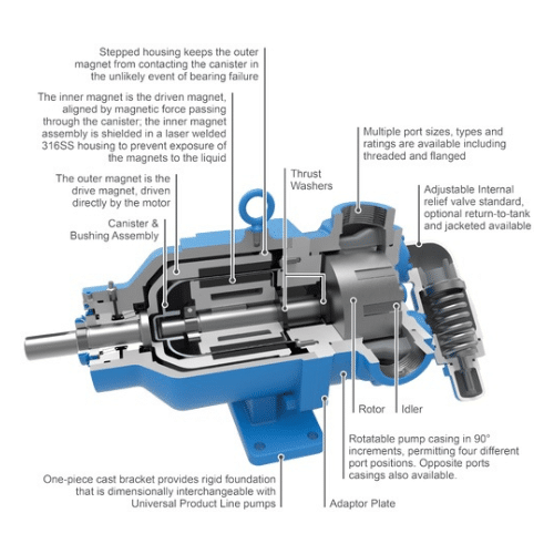The canister of 8124A Series pumps is hermetically sealed, providing the highest level of liquid containment available by eliminating traditional dynamic shaft seals associated with hazardous, hard to seal, or expensive liquids. These mag drive pumps are designed to handle caustics, isocyanates, adhesives, solvents, mercaptans that require continuous duty, including both thin and thick liquids. They even offer short term run dry capability, unlike many mag drive pumps